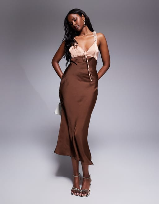 ASOS DESIGN - Vestito midi marrone in raso con bustino a contrasto e volant