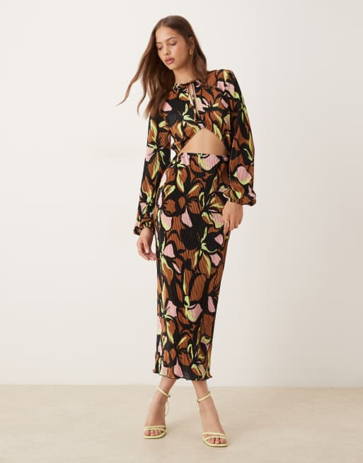 ASOS DESIGN - Vestito midi plissé scuro a fiori con cut-out e fiocco sul davanti