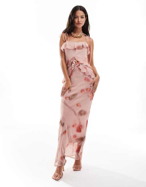 ASOS DESIGN - Vestito midi rosa con stampa di rose, volant, laccetti e spalline sottili