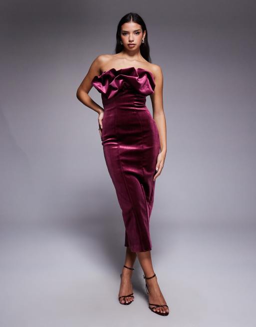 ASOS DESIGN - Vestito midi strutturato in velluto doppio a fascia bordeaux con volant sul seno