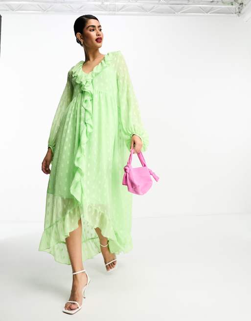 ASOS DESIGN - Vestito midi verde salvia plumetis a maniche lunghe con volant sul davanti