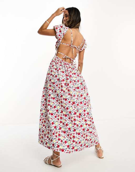 ASOS DESIGN - Vestito milkmaid midi con busto arricciato e apertura con laccio sul retro con stampa a fiori vivaci