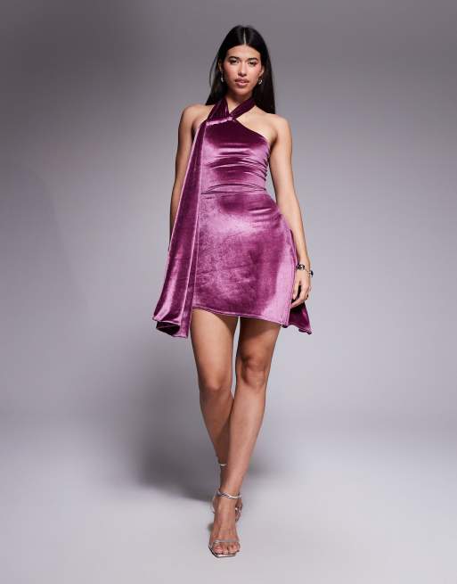 ASOS DESIGN - Vestito skater corto lilla in velluto allacciato al collo