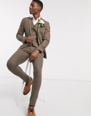 ASOS DESIGN wedding - Abito slim in misto lana a spina di pesce cammello