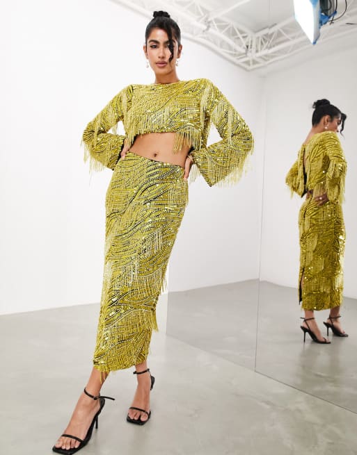 ASOS EDITION - Completo nero e giallo con frange e perline con gonna e top con spacco sul retro