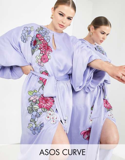 ASOS EDITION Curve - Vestito midi in raso blu ricamato a fiori con cintura