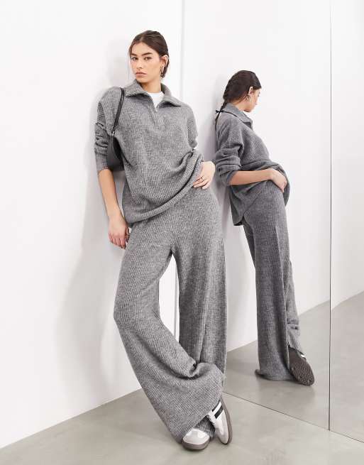 ASOS EDITION - Pantaloni in maglia a fondo ampio grigio chiaro a coste in coordinato