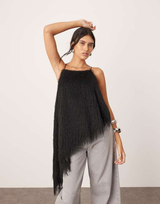 ASOS Edition - Top asimmetrico nero testurizzato con frange