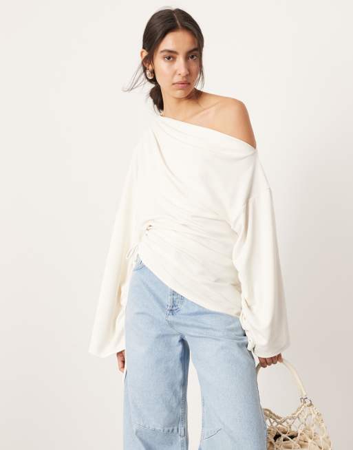 ASOS Edition - Top in jersey bianco con spalla scoperta e maniche arricciate