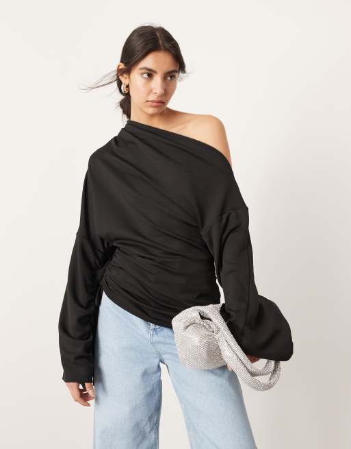 ASOS Edition - Top in jersey nero con spalla scoperta e maniche arricciate