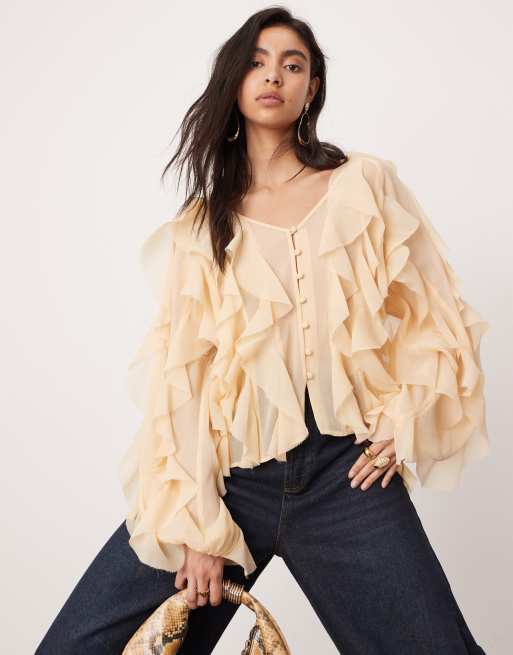 ASOS Edition - Ultimate - Blusa beige con bordi grezzi e volant