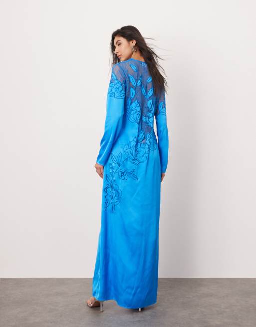 ASOS EDITION - Vestito lungo a colonna blu cobalto ricamato con pannello in pizzo e maniche lunghe