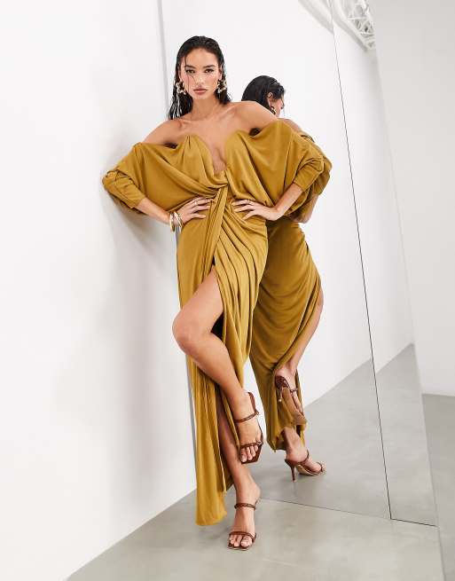 ASOS EDITION - Vestito lungo a maniche lunghe con scollo molto profondo e drappeggi color ocra