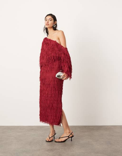 ASOS Edition - Vestito lungo ampio rosso con frange e spalla scoperta