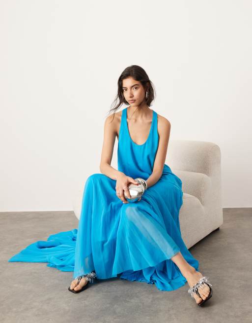 ASOS EDITION - Vestito lungo blu con gonna in chiffon e vita scesa