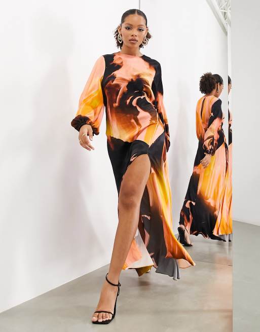 ASOS Edition - Vestito lungo in raso a maniche lunghe con spacco con stampa astratta effetto pennellate
