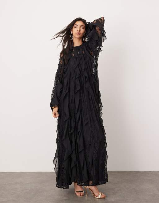 ASOS EDITION - Vestito lungo nero con bordi grezzi, volant e inserto in pizzo