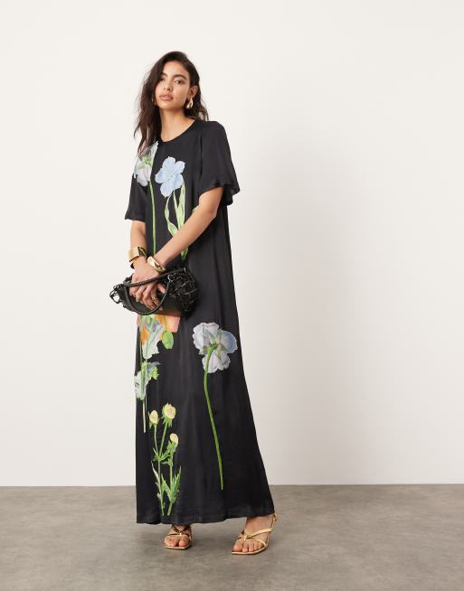 ASOS EDITION - Vestito lungo stile T-shirt in raso nero a fiori ricamati