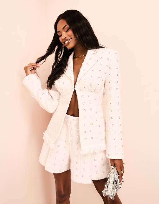 ASOS LUXE - Blazer in bouclé decorato rosa con fondo in piume sintetiche