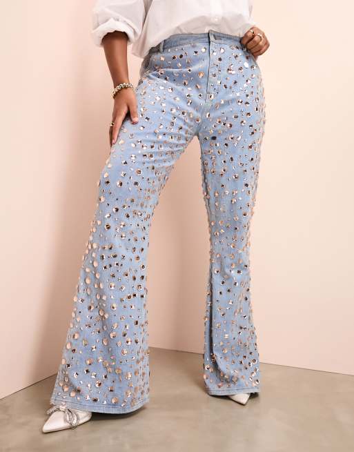 ASOS Luxe Curve - Jeans a zampa blu lavaggio medio decorati