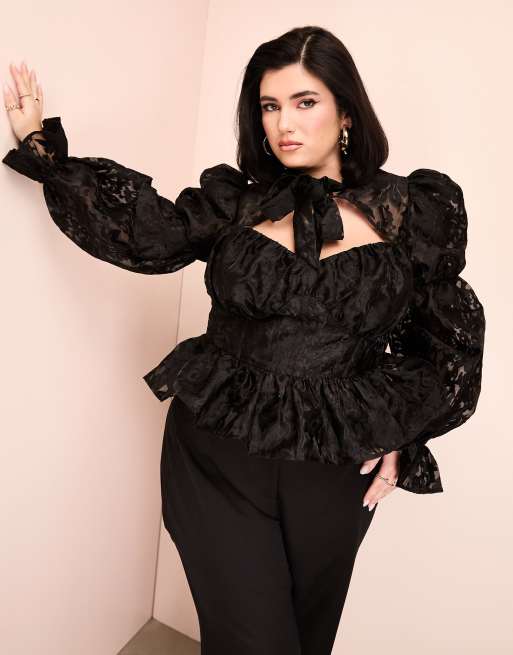 ASOS LUXE Curve - Top in pizzo nero con maniche a sbuffo e fiocco