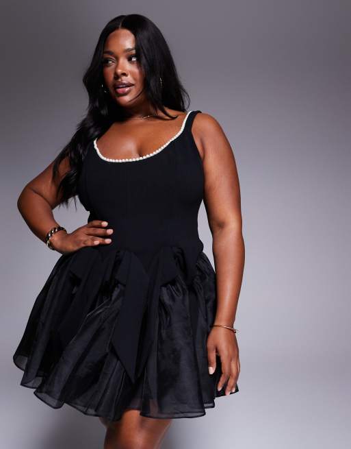 ASOS LUXE Curve - Vestito corto a corsetto nero decorato con perle e fiocco