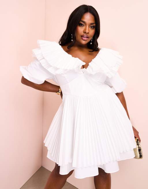 ASOS LUXE Curve - Vestito corto a pieghe skater in popeline di cotone bianco
