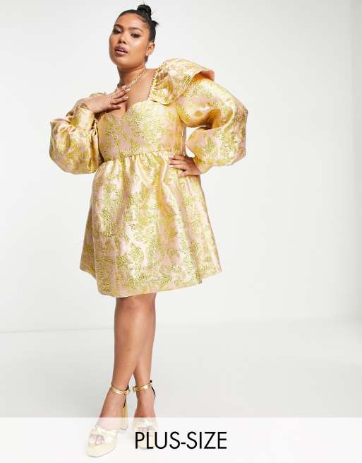 ASOS LUXE Curve - Vestito corto babydoll in jacquard oro con maniche a sbuffo