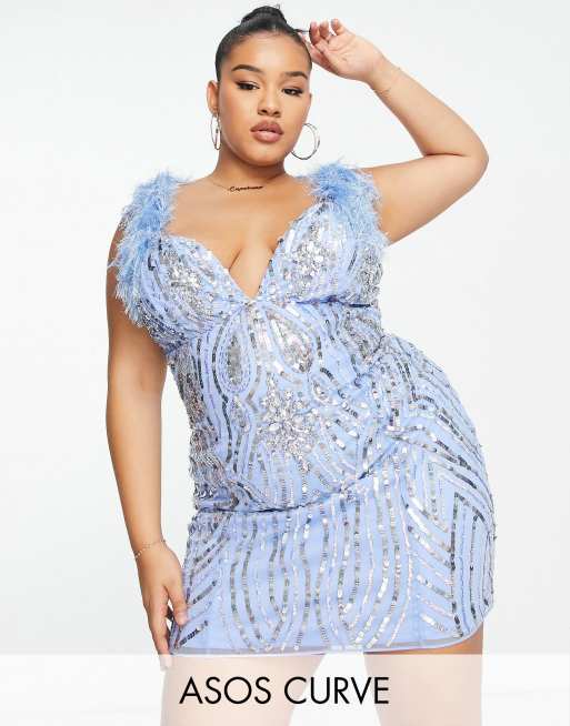 ASOS Luxe Curve - Vestito corto blu con gemme decorative e piume sintetiche