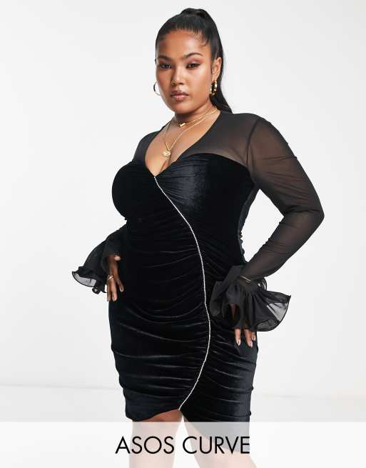 ASOS LUXE Curve - Vestito corto in velluto nero con maniche trasparenti e scollo profondo