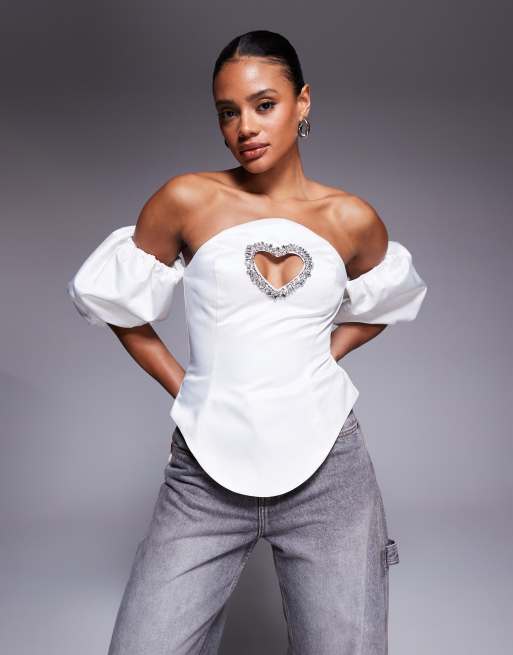 ASOS LUXE - Top bianco con cut-out a cuore decorato con maniche a sbuffo