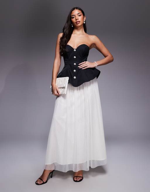 ASOS LUXE - Vestito lungo a fascia modellante con gonna in rete plumetis a pieghe bianco e nero