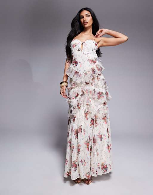 ASOS LUXE - Vestito lungo con volant e stampa a fiori