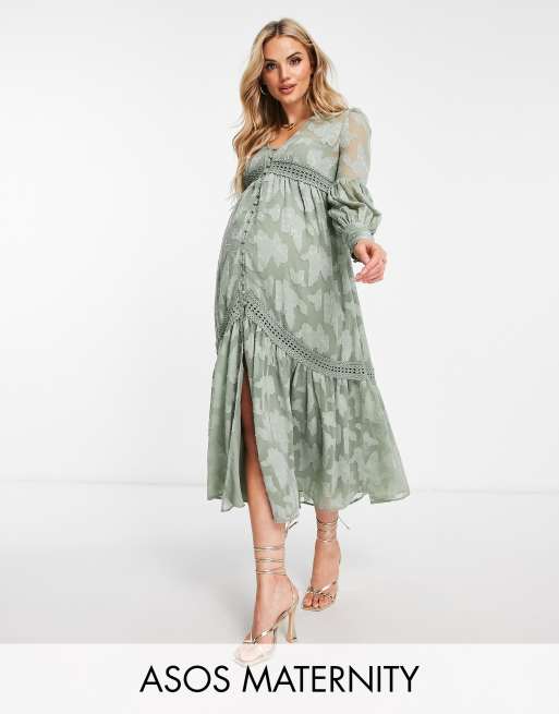 ASOS DESIGN Maternity - Vestito camicia midi con bottoni e inserti in pizzo kaki dévoré