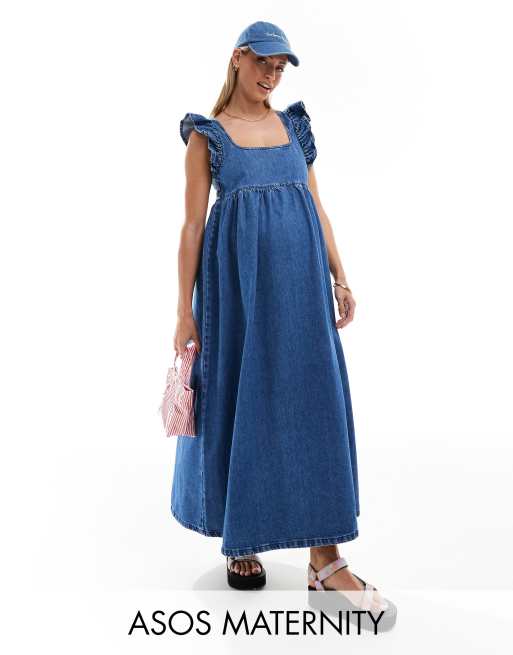 ASOS DESIGN Maternity - Vestito lungo a grembiule in denim morbido blu lavaggio medio con fiocco sul retro