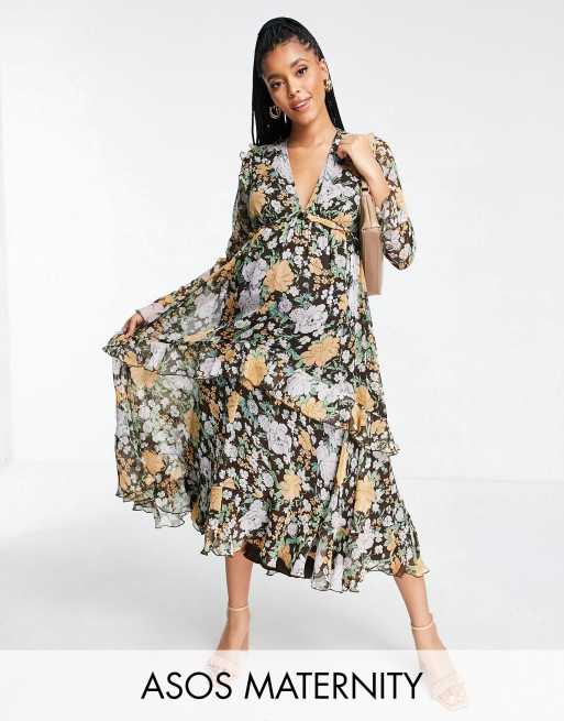 ASOS DESIGN Maternity - Vestito midi a fiori con scollo profondo, volant frontali e laccetti sul retro