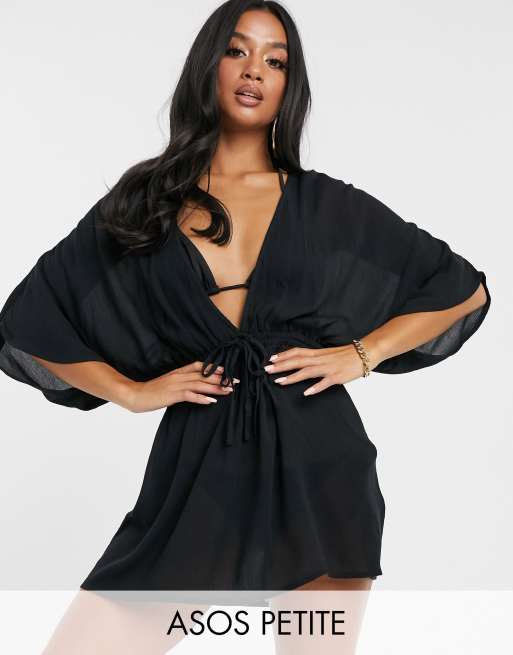 ASOS DESIGN PETITE - Copricostume in tessuto stropicciato nero con coulisse in vita e maniche drappeggiate