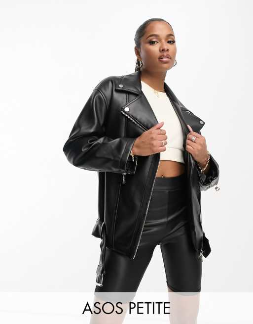 ASOS DESIGN Petite - Giacca oversize lunga in pelle sintetica nera