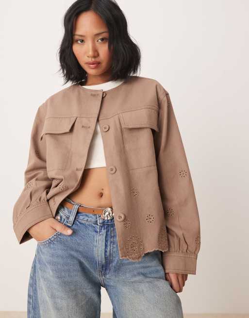 ASOS DESIGN Petite - Giacca senza colletto in twill di pizzo color fungo
