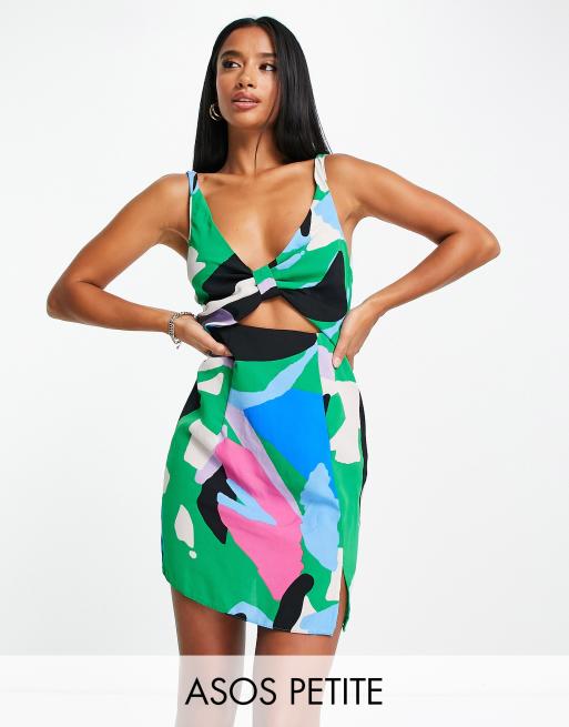 ASOS DESIGN Petite - Vestito corto annodato sul davanti con stampa astratta vivace e cut-out