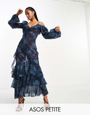 ASOS DESIGN Petite - Vestito lungo blu a fiori trasparente con volant sulle spalline