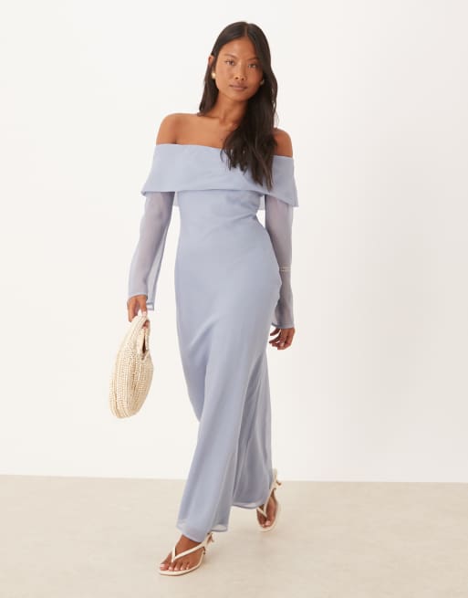 ASOS DESIGN Petite - Vestito midi blu polvere con scollo alla Bardot risvoltato