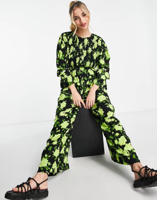 ASOS DESIGN - Tuta jumpsuit a punto smock arricciata verde fluo a fiori