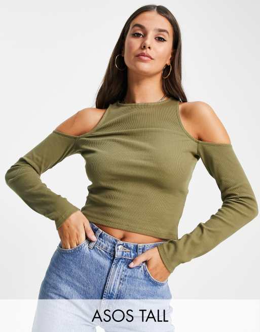 ASOS DESIGN Tall - Top a maniche lunghe con spalle scoperte kaki