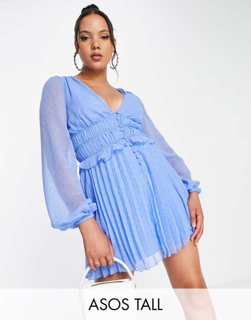 ASOS DESIGN Tall - Vestito corto a pieghe con bottoni e arricciato in vita in plumetis metallizzato blu fiordaliso