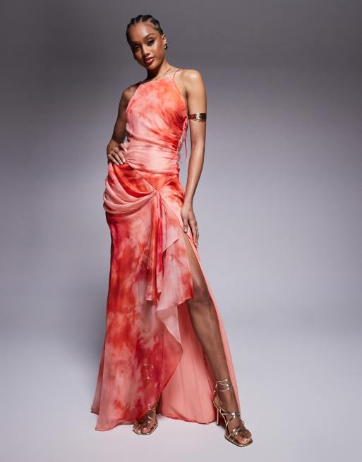 ASOS DESIGN Tall - Vestito lungo con dorso a vogatore, spalline sottili, gonna drappeggiata e stampa sfocata