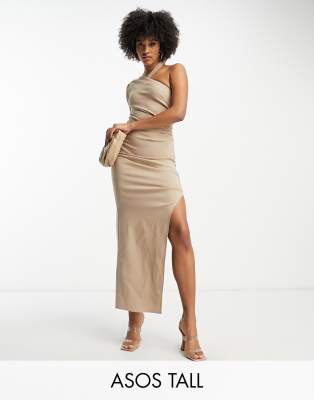 ASOS DESIGN Tall - Vestito midi fasciante monospalla in bengalina color cammello con spacco e scollo avvolgente