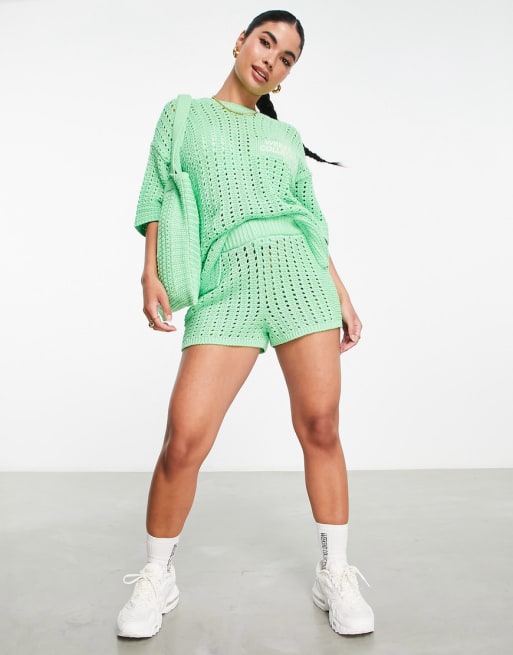 ASOS Weekend Collective - Coordinato con pantaloncini e top verde all'uncinetto con logo