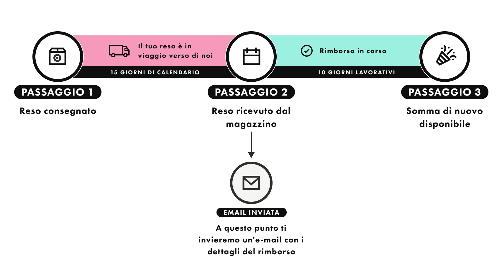 Il tracciamento del reso mostra che è stato consegnato, ma non hai ancora ricevuto un'e-mail? Abbiamo bisogno dell'intero periodo di tempo specificato sopra per elaborare tutti i resi in entrata, soprattutto durante i periodi di punta.