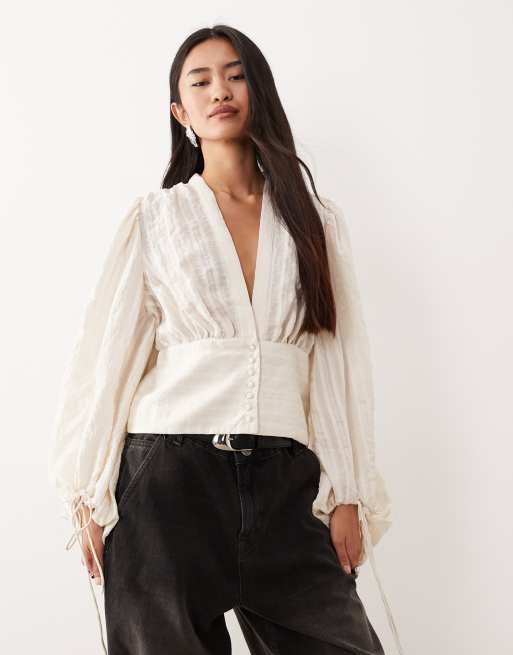 AWARE - Blusa stile bohémien color crema con maniche a palloncino e bottoni